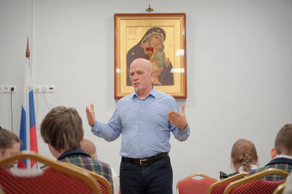 В актовом зале школы при Алексеевском монастыре ученики 5–11 классов встретились с руководителем ГБУ «МАЦ» Евгением Балашовым. Мероприятие прошло в формате «100 вопросов к взрослому».