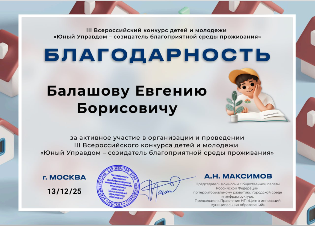 Председатель Комиссии Общественной палаты Российской Федерации по территориальному развитию, городской среде и инфраструктуре Андрей Максимов выразил благодарность руководителю ГБУ «МАЦ» Евгению Балашову и сотрудникам учреждения за активное участие в организации и проведении III Всероссийского конкурса детей и молодежи «Юный Управдом – созидатель благоприятной среды проживания».