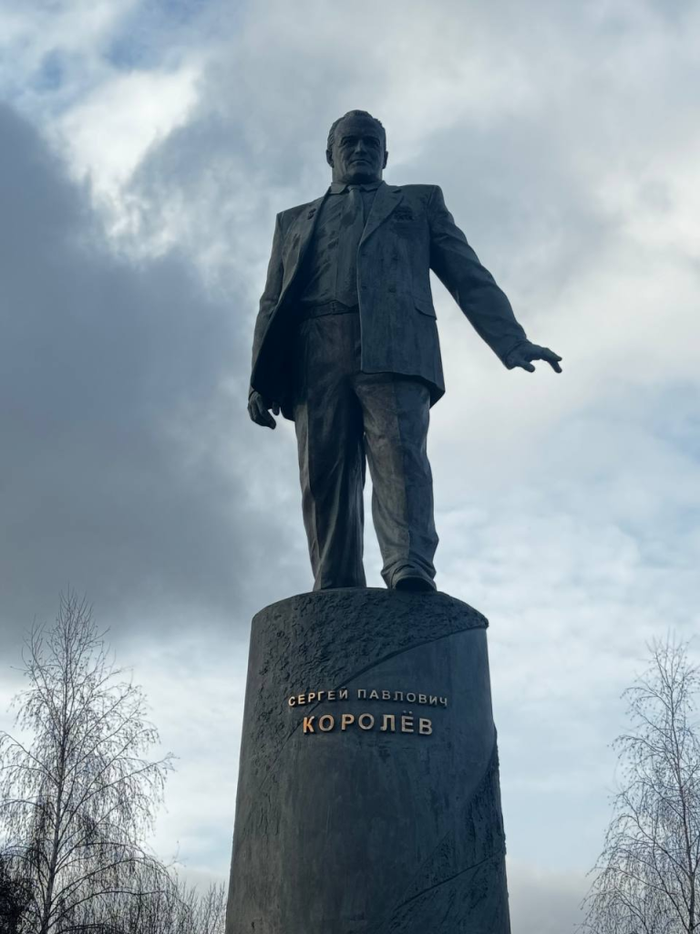 Еще один памятник Королеву находится на аллее Космонавтов. Это пятиметровая бронзовая фигура на высоком гранитном постаменте. Здесь основоположник практической космонавтики запечатлен в костюме с отведенной в сторону рукой. На постаменте расположены барельефы, символизирующие первый искусственный спутник Земли, взлет ракеты «Восток» с Юрием Гагариным и первый выход космонавта Алексея Леонова в открытый космос.